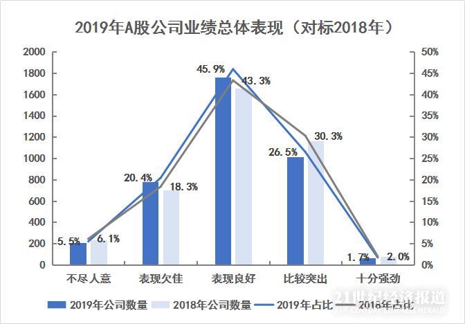 2019年年度报告披露结束,截至2019年5月12日,据飞笛科技不完全数据统计,两市共有3833家公司发布了2019年年报。2019年A股上市公司成绩单如何?南财AI新闻实验研究室将统计到的这3833家公司财报的核心指标梳理成盈利能力、成长能力、营运能力、偿债能力、其他能力五大能力,并综合加分得到每家公司的业绩总星级,依次为不尽人意(0-8星)、表现欠佳(9-12星)、表现良好(13-16星)、比较突出(17-20星)、十分强劲(21-25星)五个等级。