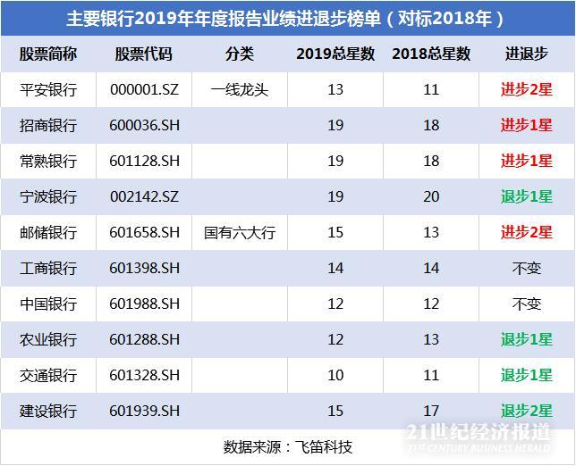 从一线龙头银行来看,业绩进步最大的是平安银行,主要表现在成长能力和偿债能力上,成长能力具体表现为营收和净利润同比增速在35家银行排名的上升,营收和净利润同比增速排名分别由2018年的23名和18名分别上升至2019年的12名和11名;偿债能力则表现为资产负债率排名的上升,由2018年的28名上升至2019年的18名,成长能力和偿债能力双双提升,综合业绩总星级进步2星。