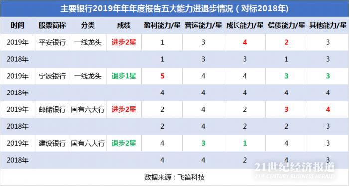 建设银行退步则表现在营运能力和成长能力上,具体表现不良贷款比例和净利润增长率排名的下降,不良贷款比例排名由2018年的17名降至19名,净利润增长率由2018的26名下降至2019年的34名,因此业绩综合星级退步2星。