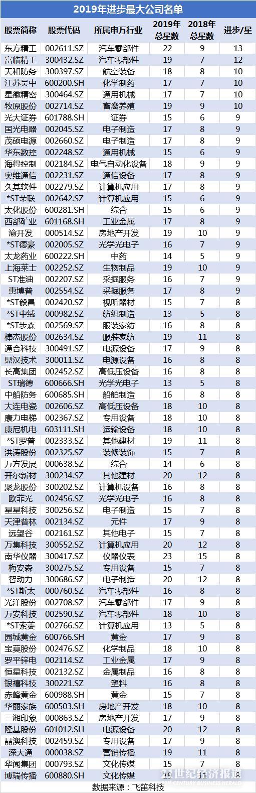 此外,飞笛科技还将市场上3883家公司中,将市场上进步、退步跨度最大的公司(即总星级进步/退步8星,进步/退步2级)进行了梳理,共得到进步最大的公司64家和退步最大的公司24家,分别占据2019年发布年报公司的1.7%和0.06%。