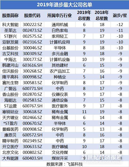 从业绩总星级退步最大的公司来看,多家涉及到医疗行业,如中药、化学制药、医疗服务、医疗机械。其中中药股广誉远2019年结束了连续3年高速增长势头,业绩总星级退步9星,康恩贝2019年业绩亏损且大幅下降,业绩总星级退步8星。