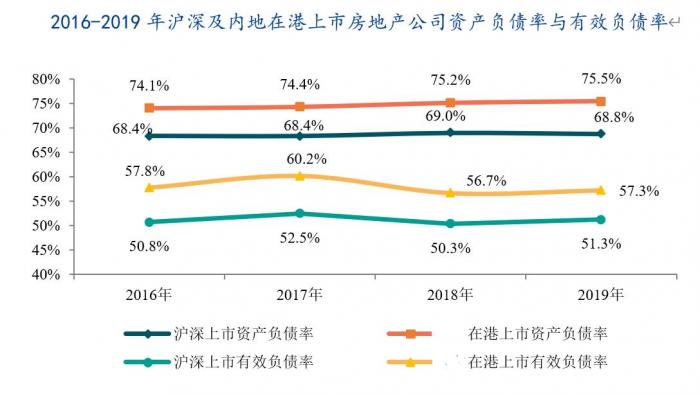 负债率方面,沪深上市资产负债率均值同比下降0.2个百分点至68.8%,内地在港上市房地产公司资产负债率均值同比上升0.3个百分点至75.5%。2019年,通过过去两年对现金流的严格把控房地产上市公司手持现金及现金等价物情况得到明显改善。其中,内地在港现金及现金等价物净增加额均值同比增加13.8%至60.5亿元,沪深上市房地产公司均值为22.1亿元,同比提升16.8%。