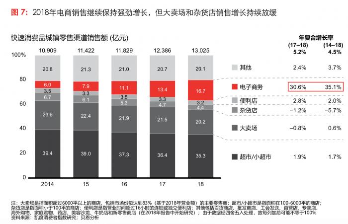 2018年,凯度消费者指数调整了电商渠道数据估算,以反映新的市场现实和电商的快速增长。在新的渠道视角中,电子商务占城市快速消费品市场在家消费的份额达到16.7%,而调整前这一比例为10%。2017-2018年,电商渠道增速为30.6%,相比2014-2018年的35.1%略有放慢。与前几年类似,不断增长的渗透率和购物频率仍然是主要的增长驱动力,同时客单量和平均售价保持稳定。