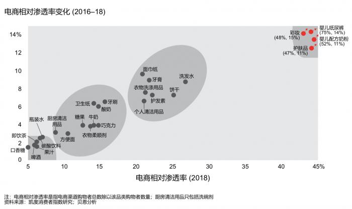 对于化妆品品牌来说,好消息是美妆类产品确实是电商占比最高的品类之一。在贝恩调研的26个快速消费品品类中,4个婴儿用品和美妆品类约占线上总销售额的70%,有较高的电商相对渗透率且电商渗透率增长较快。