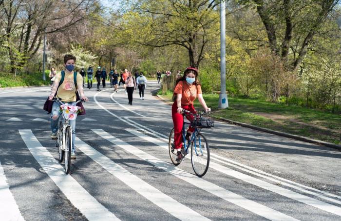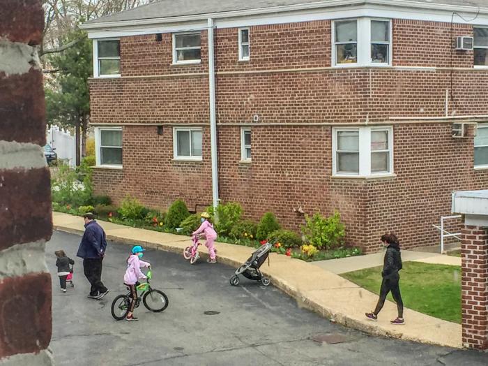 (纽约皇后区,小孩子戴口罩骑单车玩耍 顾乡/摄)