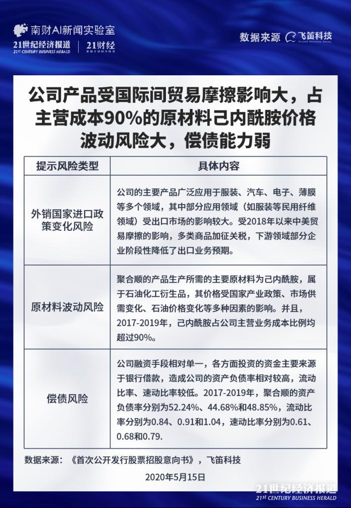 其次是原材料波动风险,聚合顺的产品生产所需的主要原材料为己内酰胺,属于石油化工衍生品,其价格受国家产业政策、市场供需变化、石油价格变化等多种因素的影响。并且,2017-2019年,己内酰胺占公司主营业务成本比例均超过90%。