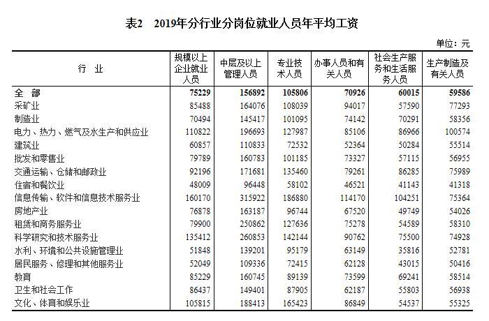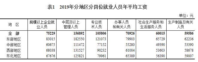2019年全国规模以上企业就业人员年平均工资为75229元,比上年增长10.0%。其中,中层及以上管理人员156892元,增长8.1%;专业技术人员105806元,增长9.4%;办事人员和有关人员70926元,增长11.2%;社会生产服务和生活服务人员60015元,增长9.2%;生产制造及有关人员59586元,增长8.0%。中层及以上管理人员平均工资最高,是全部就业人员平均水平的2.09倍;生产制造及有关人员平均工资最低,是全部就业人员平均水平的79%。岗位平均工资最高与最低之比为2.63,比上年缩小0.01。
