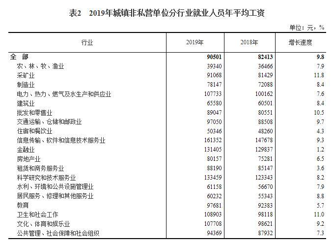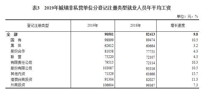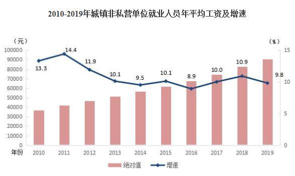 2019年全国城镇非私营单位就业人员年平均工资为90501元,比上年增加8088元,名义增长9.8%,增速比2018年回落1.1个百分点。扣除价格因素,2019年全国城镇非私营单位就业人员年平均工资实际增长6.8%。