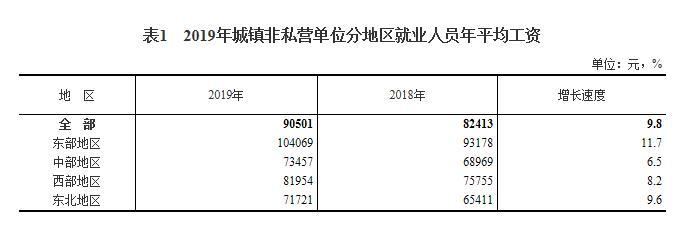 2019年,我国经济运行总体平稳、稳中有进,就业形势保持稳定,全国城镇单位就业人员平均工资稳步增长。2019年全国城镇非私营单位就业人员年平均工资为90501元,比上年增长9.8%(以下如无特别说明,均为比上年名义增速),扣除价格因素,实际增长6.8%;城镇私营单位就业人员年平均工资为53604元,比上年增长8.1%,扣除价格因素,实际增长5.2%。