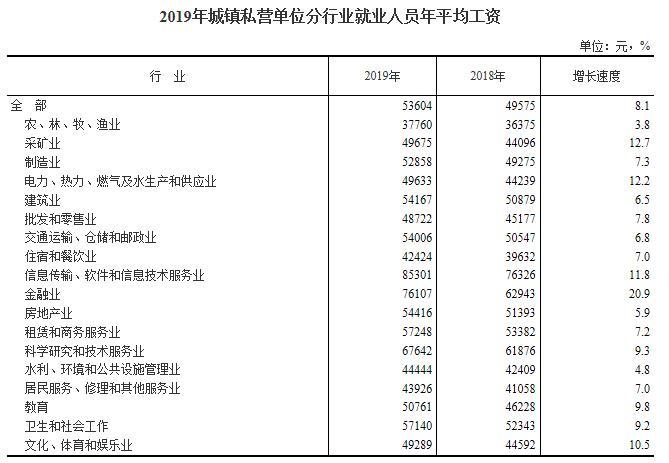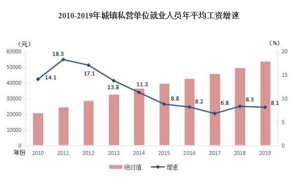 2019年全国城镇私营单位就业人员年平均工资为53604元,比上年增加4029元,名义增长8.1%,增速比2018年回落0.2个百分点。扣除价格因素,2019年全国城镇私营单位就业人员年平均工资实际增长5.2%。