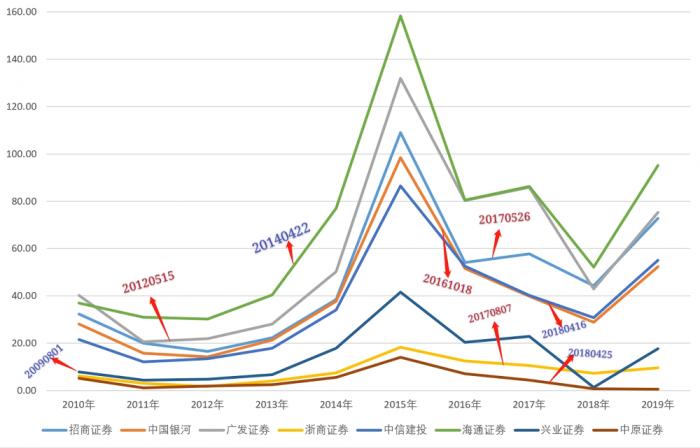 (注:红色为监管领导引入年份,广发、中原引入年份分别为2012年、2009年)