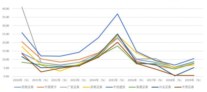 21世纪经济报道统计了上述8家券商2010年-2019年的经营数据,无论从归母净利润还是从ROE的角度,8家券商经营数据的整体走势仍然保持着较高的相似度,例如,可以看出:2015年是券商业绩大年,2016年受挫严重,2017年普遍修复,2018年又遇重挫,2019年喘息回升——这其中,各家券商的归母净利润和ROE也呈现出趋同的上升或下降。