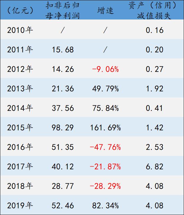 此外,尽管有出身风险处置部门的领导加持,上市后的中国银河在风控上并未取得亮眼的成绩。2016-2019年,中国银河资产(信用)减值损失分别为2.53亿元、6.82亿元、4.08亿元、4.08亿元。上市前,中国银河的资产减值损失则长期维持在低位,2010-2015年,仅2015年减值损失1.41亿元、2013年减值损失1.92亿元,其余各年份减值损失均维持在1亿以下。