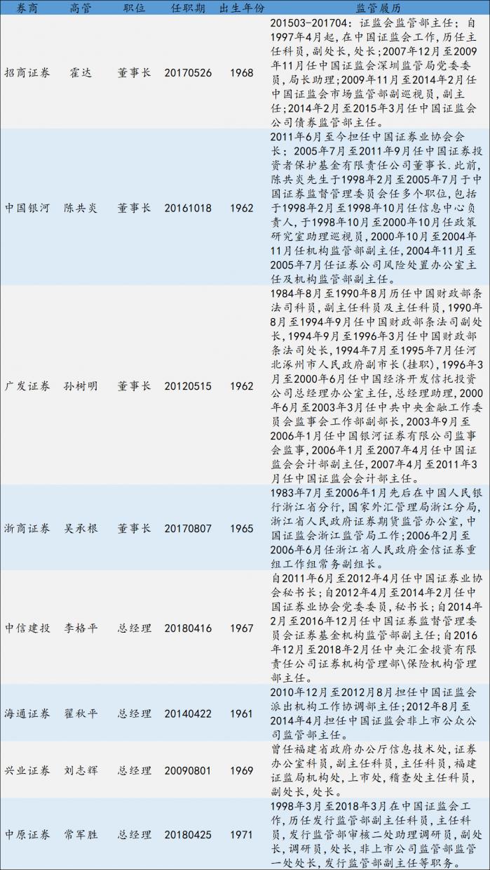 总经理层面:中信建投总经理李格平2018年4月任职,此前曾任证监会证券基金机构基金监管部副主任;海通证券总经理翟秋平2014年4月任职,此前担任证监会非上市公众公司监管部主任;兴业证券总经理刘志辉2009年8月任职,此前曾任福建证监局机构处处长;中原证券总经理常军胜2018年4月任职,此前任职证监会发行监管部副主任。