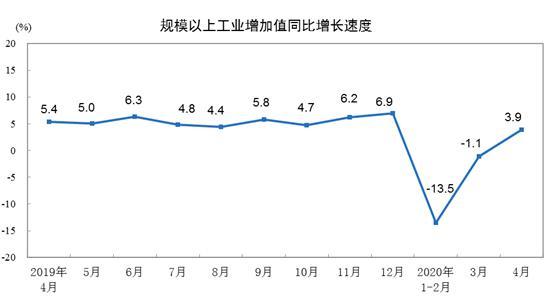 4月份,全国规模以上工业增加值同比增长3.9%,3月份为下降1.1%;环比增长2.27%。1-4月份,全国规模以上工业增加值同比下降4.9%,降幅比1-3月份收窄3.5个百分点。