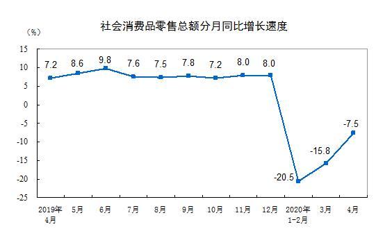 4月份,社会消费品零售总额28178亿元,同比下降7.5%,降幅比3月份收窄8.3个百分点;环比增长0.32%。1-4月份,社会消费品零售总额106758亿元,同比下降16.2%,降幅比1-3月份收窄2.8个百分点。