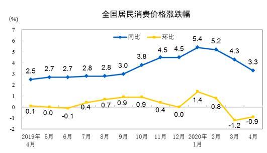 4月份,全国居民消费价格同比上涨3.3%,涨幅比3月份回落1.0个百分点;环比下降0.9%。1-4月份,全国居民消费价格同比上涨4.5%。