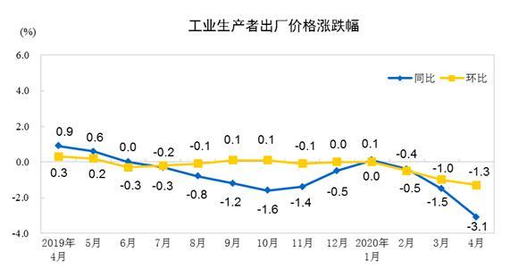 4月份,全国工业生产者出厂价格同比下降3.1%,降幅比3月份扩大1.6个百分点;环比下降1.3%。工业生产者购进价格同比下降3.8%,环比下降2.3%。