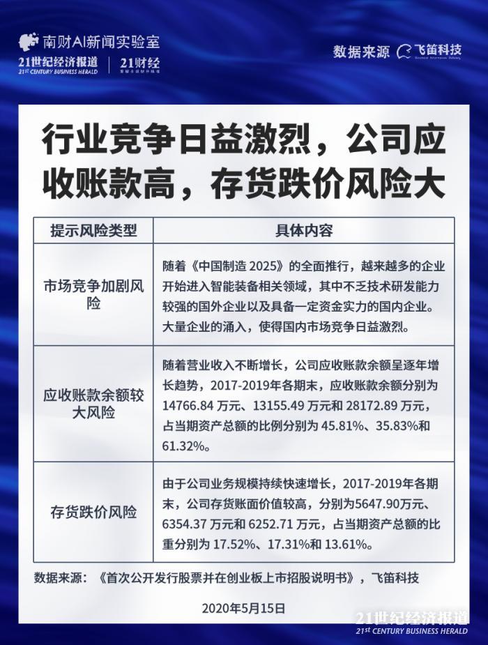 首先是市场竞争加剧风险,公司提醒,随着《中国制造 2025》的全面推行,越来越多的企业开始进入智能装备相关领域,其中不乏技术研发能力较强的国外企业以及具备一定资金实力的国内企业。大量企业的涌入,使得国内市场竞争日益激烈。