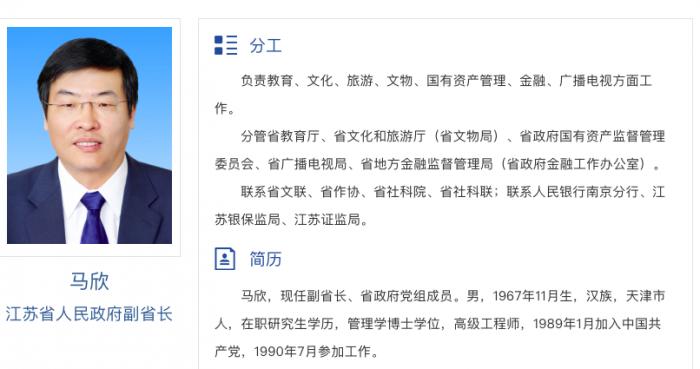 5月15日下午,记者查阅江苏省人民政府官网,马欣已在省政府领导名单中,他的分工也已明确。