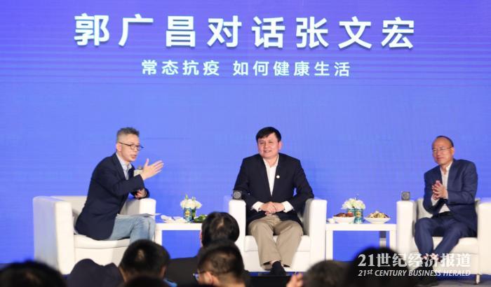 活动现场,复星国际董事长郭广昌与上海华山医院感染科主任张文宏同场对话,探讨“常态抗疫,如何健康生活”。
