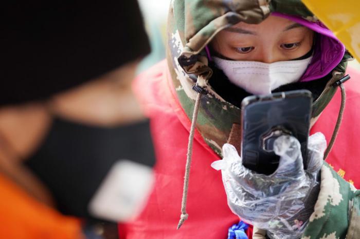 1993年出生的李文琦,是在深圳工作的哈尔滨人,春节返乡回哈后成为社区志愿者。她说:“国家有难,我们‘90后’正值青年,身强力壮,应该往前冲。”图为李文琦(右)在检查往来车辆人员的手续证明。新华社记者