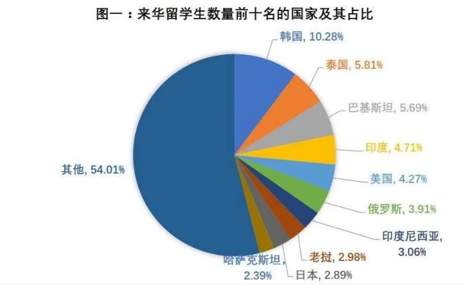 华东理工大学2019年的一份报告指出,从国别来看,来华留学生数量占前十名的国家分别为:韩国、泰国、巴基斯坦、印度、美国、俄罗斯、印度尼西亚、老挝、日本和哈萨克斯坦。