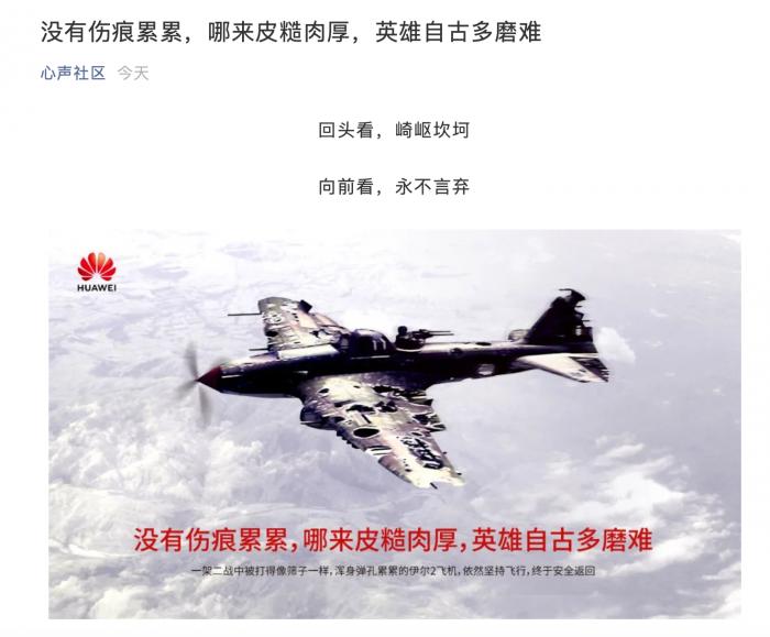 5月16日,华为心声社区发文《没有伤痕累累,哪来皮糙肉厚,英雄自古多磨难》,写道:“回头看,崎岖坎坷;向前看,永不言弃。”并搭配一张弹孔累累仍坚持飞行的伊尔2飞机图片。