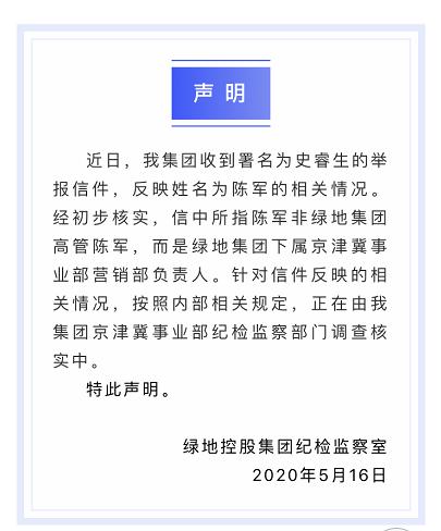 5月16日晚,绿地控股集团纪检监察室发布声明:近日,我集团收到署名为史睿生的举报信件,反映姓名为陈军的相关情况。经初步核实,信中所指陈军非绿地集团高管陈军,而是绿地集团下属京津冀事业部营销部负责人。