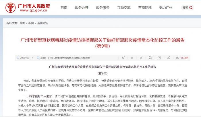 5月17日,广州市发布《广州市新型冠状病毒肺炎疫情防控指挥部关于做好新冠肺炎疫情常态化防控工作的通告(第9号)》。