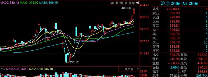 中国国际期货高级研究员汤林闽在接受21世纪经济报道记者采访时表示:5月18日,沪金2006合约跳空高开,盘中突破400元/克,再创新高。国际公共卫生事件本身和相关影响目前依然构成黄金的主要逻辑。一是在国际疫情虽趋平缓但仍未出现明显拐点的情况下,欧美强推经济重启的举措令市场出现部分对二次疫情的担忧。二是上周末美联储主席鲍威尔的言论冲击了市场。他表示美国经济复苏可能要延长到2021年底,这超出市场预期,给认为经济重启后能很快复苏的投资者当头一棒;同时,他表示美国二季度GDP很可能萎缩20%-30%,而美联储的弹药还未耗尽,在其先前明确表示不考虑负利率的情况下。这强化了市场对美联储更多QE和实施负利率的预期。三是贸易摩擦的阴云又再现的迹象,在市场饱受疫情冲击之苦的情况下,更加恶化了市场预期和情绪。这些因素与其他多因素一并,刺激了金价上扬,创出新高。