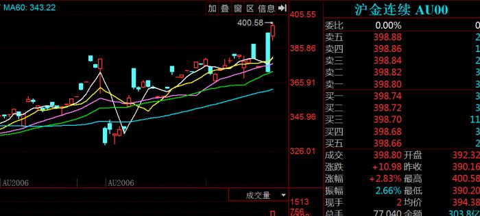 黄金再度打开上升通道,今日早盘黄金现货已经站上1760美元/盎司, 与此同时周一上午10:08,沪银期货主力合约涨停,报4201元/千克。沪金主力合约涨幅扩大至2.62%,突破400元/克关口,刷新2008年上市以来新高。现货钯金日内涨超4%,报1988.25美元/盎司。