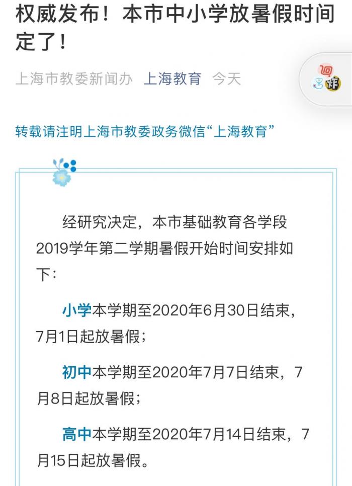 5月18日,据上海市教委新闻办微信公众号消息,经研究决定,上海市基础教育各学段2019学年第二学期暑假开始时间安排如下: