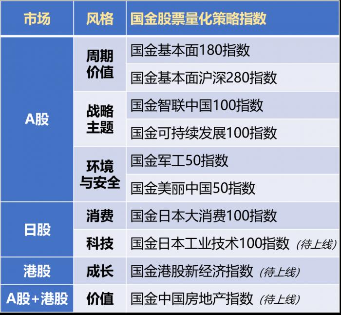 截至目前,除了债券策略指数线之外,国金股票策略指数线已涵盖宽基策略指数、主题策略指数、行业策略指数等三个不同收益风险层级的类别;加上已上线和计划中的海外股票策略指数,已初步形成跨市场覆盖、多种投资风格的股票策略指数矩阵。