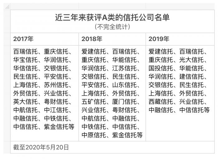 近期,中融信托、重庆信托、爱建信托、交银国际信托、民生信托纷纷在自家官方微信公众号上公布收到《中国信托业协会关于信托公司2019年度行业评级结果的通知》,并获评行业最高评级——A类。