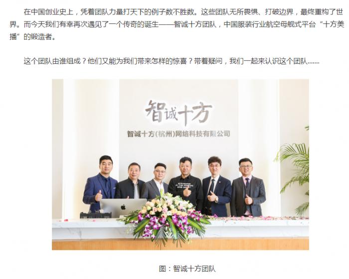 在这篇文章中,将智诚十方团队称之为“中国服装行业航空母舰式平台‘十方美播’的锻造者。”同时,对整个智诚十方团队进行大致介绍。