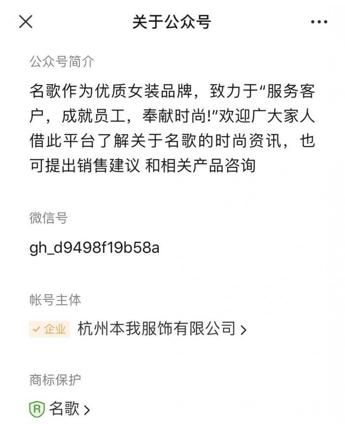 不过,该品牌却有相关公众号,账户主体正是杭州本我服饰有限公司。最近更新的内容为今年3月31日一条有关公司春季新品上市的文章。
