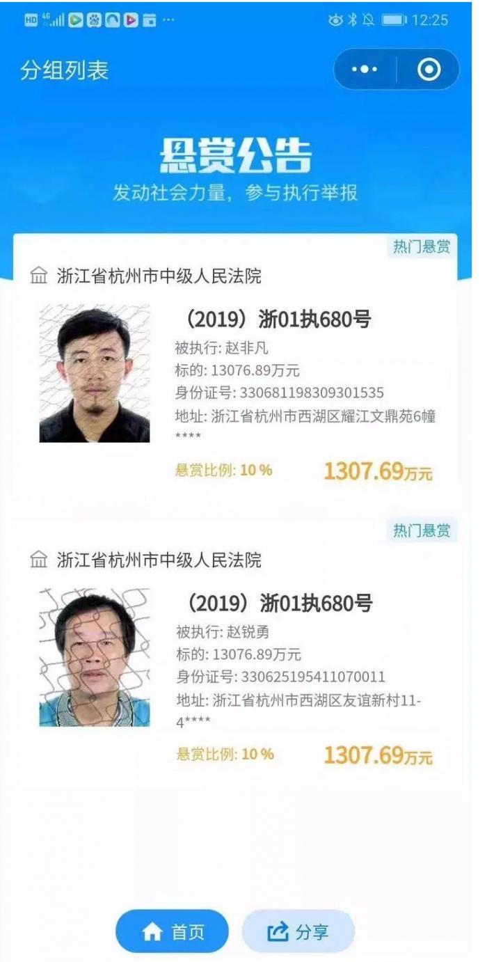 2019年12月,杭州市中级人民法院曾发布了一则悬赏公告,以1300多万的高价,悬赏征集财产线索,而被执行人恰是赵锐勇、赵非凡父子。