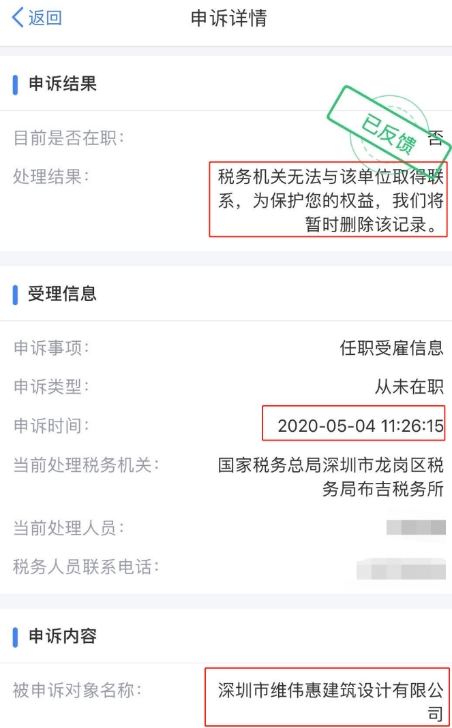 “新的工资收入,重新提交申诉。”接线人员称,电话和上门均未联系到该公司,现有手段是对申诉内容进行处理,该公司之后日常的申报会被阻断,所有税都申报不了,五月应该是最后一笔。