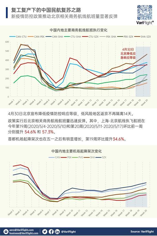 4月30日北京宣布降低疫情防控响应等级,低风险地区返京不再隔离14天。政策实行后北京相关商务航线航班量迅速反弹。其中,上海-北京航线执飞航班在今年第19周(2020/5/4-2020/5/10)和第20周(2020/5/11-2020/5/17)环比前一周分别提升54.6%和57.3%。首都机场起降架次也在五一之后有明显增长,第19周环比提升34.6%。