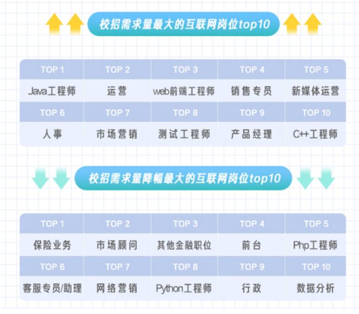 从职位上来看,互联网行业校招岗位中,与主要业务相关性不大的职能类、保险业务、市场顾问等岗位,用人需求大幅降低。降幅最高的十大岗位,幅度都在50%以上——其中保险业务类岗位受疫情影响用人需求下降最多,降幅83%。校招需求增幅最多的岗位,集中在java开发、运营、web前端,Java开发工程师。