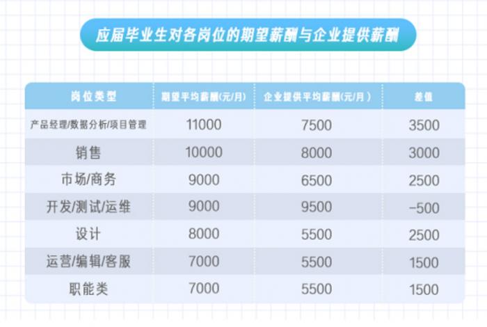 综合各类型岗位企业所提供的薪酬来看,毕业生平均起薪6857元。而产品经理、数据分析、项目管理、销售、市场商务类职位的企业薪酬与毕业生期待相差甚远,其中产品类岗位(产品经理、产品策划分析、项目管理等)薪酬与毕业生期望薪酬差值最大,达3500元。