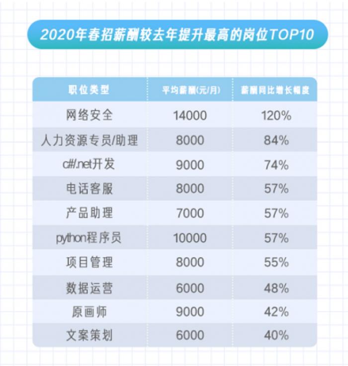 但也有一些岗位薪酬逆势增长,例如网络安全、运营等岗位的薪酬相比于去年同期不降反升。其中,网络安全相关岗位平均薪酬最高,达到14000元,同比去年同期上升120%——被誉为“校招”中的“金饭碗”。