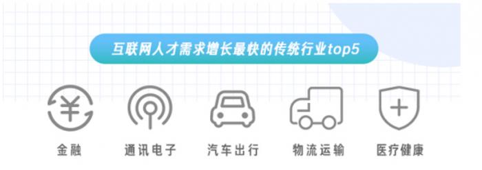 2020年3月,中央提出加快5G网络、数据中心等新型基础设施建设进度。随着“新基建”政策的出台,更多传统企业加速互联网化,加大对互联网人才的招聘力度。拉勾校招报告显示,金融、通讯电子、汽车出行、物流运输、医疗健康成为互联网人才需求增长最快的传统行业top5——这些行业的人才正在经历互联网化升级。