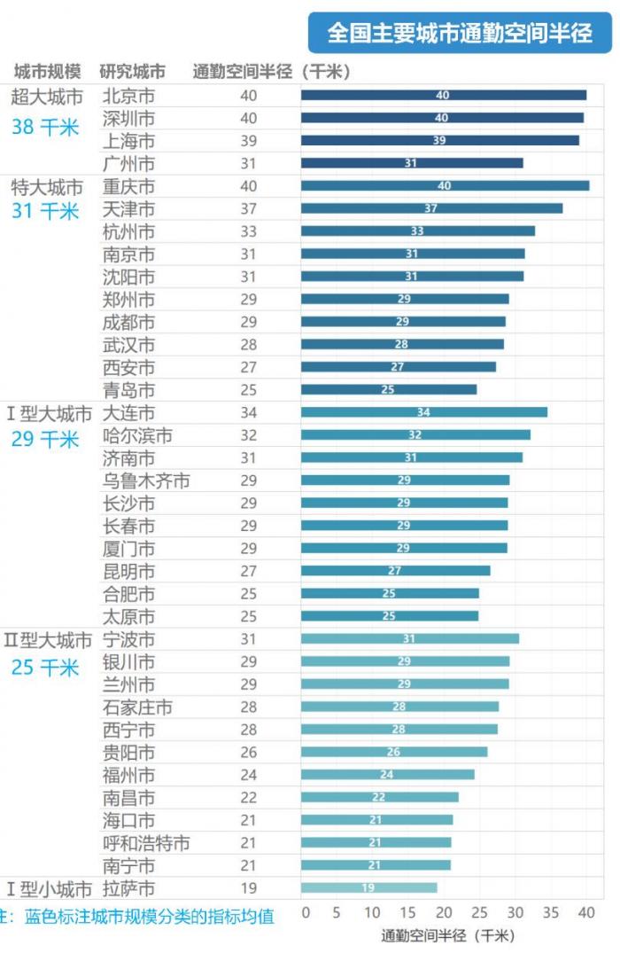 报告数据显示,北京、深圳、重庆的通勤空间半径均为40千米,上海为39千米,其次为天津37千米,广州则为31千米。通勤空间半径越大,说明城市通勤紧密联系的空间范围越大。