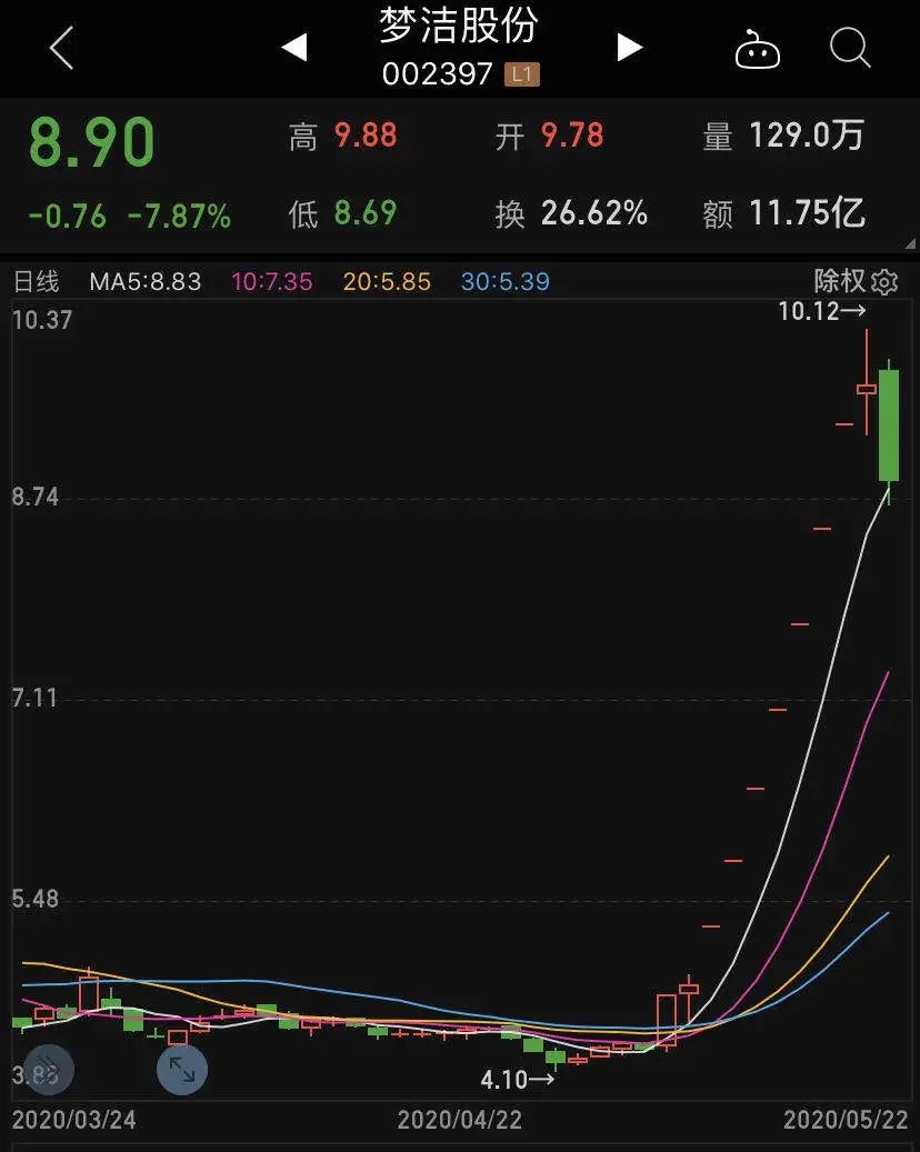 5月12日-5月20日,梦洁股份连续拉出7个涨停板,5月21日梦洁股份盘中股价创下10.12元/股历史新高。以5月8日涨停开始计算,梦洁股份在9个交易日内走出8个涨停,市值也大增44亿元。