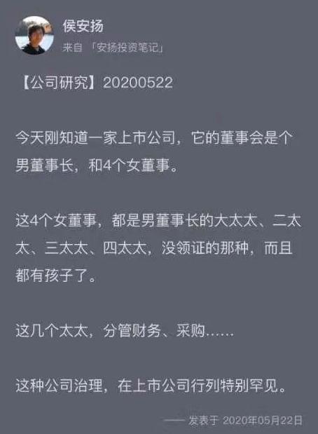 另外,牵扯其中的其他3位女董事,则来自于深圳市上善若水资产管理有限公司董事长侯安扬的一份投资笔记。