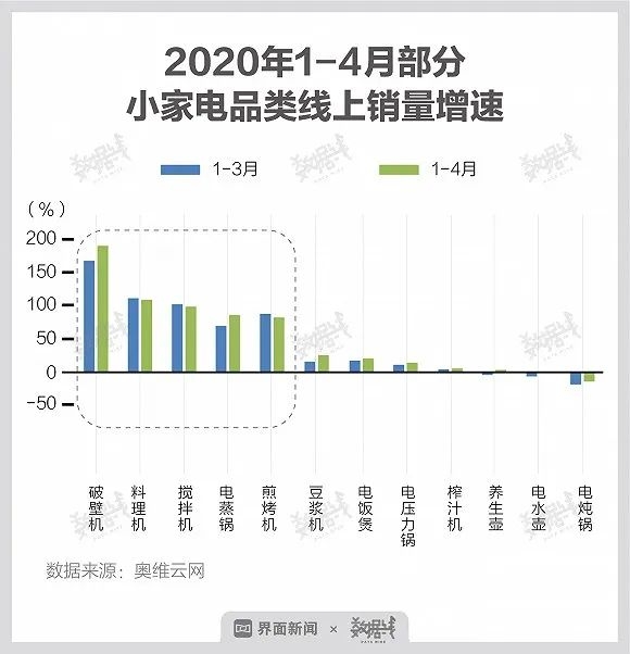 据奥维云网数据,一季度电饭煲、料理机、榨汁机和豆浆机的线上零售量不降反增,其中料理机的销量更是同比大增68%。
