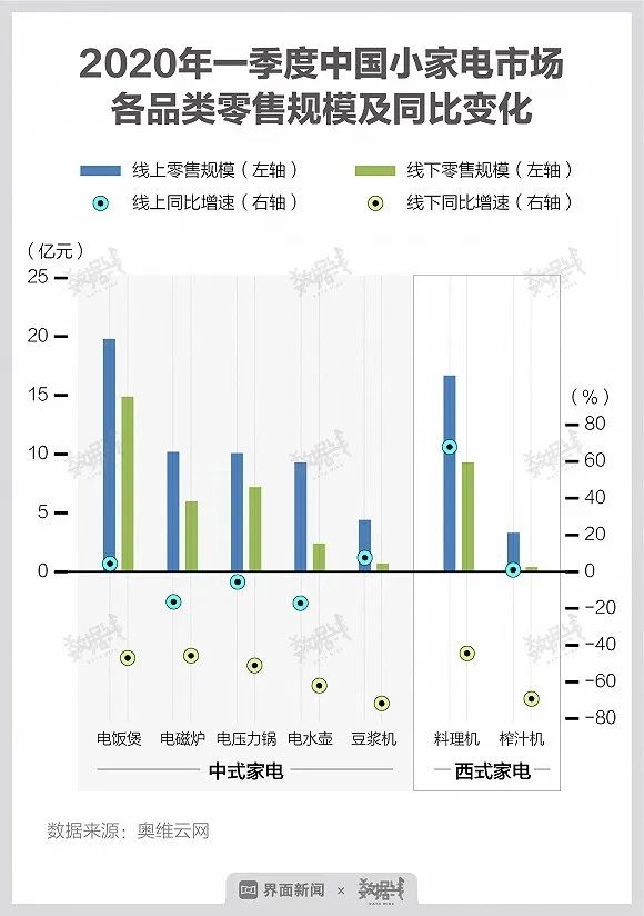 奥维云网数据显示,2020年一季度中国家电市场整体销售额为1057亿元,同比下降37.6%。其中,电饭煲、电磁炉、电压力锅、电水壶、豆浆机、料理机、榨汁机等七大小家电品类合计销售额为114.9亿元,同比下降23.7%,降幅小于家电市场整体水平。