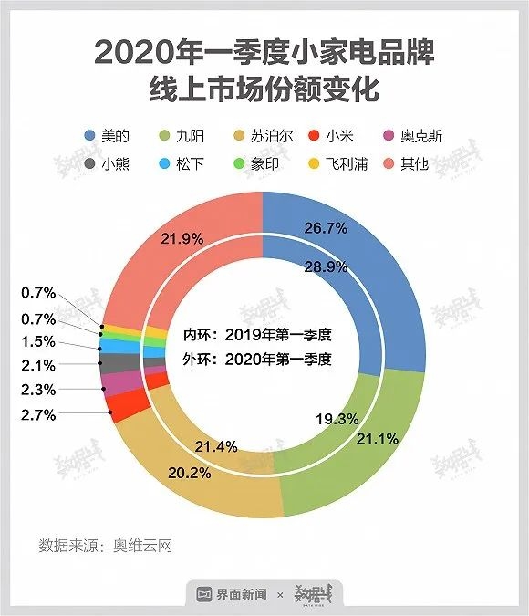 目前中国的小家电市场已进入充分竞争时代,品牌集中度高,而社交电商让一些小品牌从行业出清转为逆势入局,促使竞争多元化。从一季度品牌市占率来看,一些小品牌利用新的流量途径和品牌营销,在原本美的、九阳和苏泊尔三分天下的家电市场撬开了一些空间。